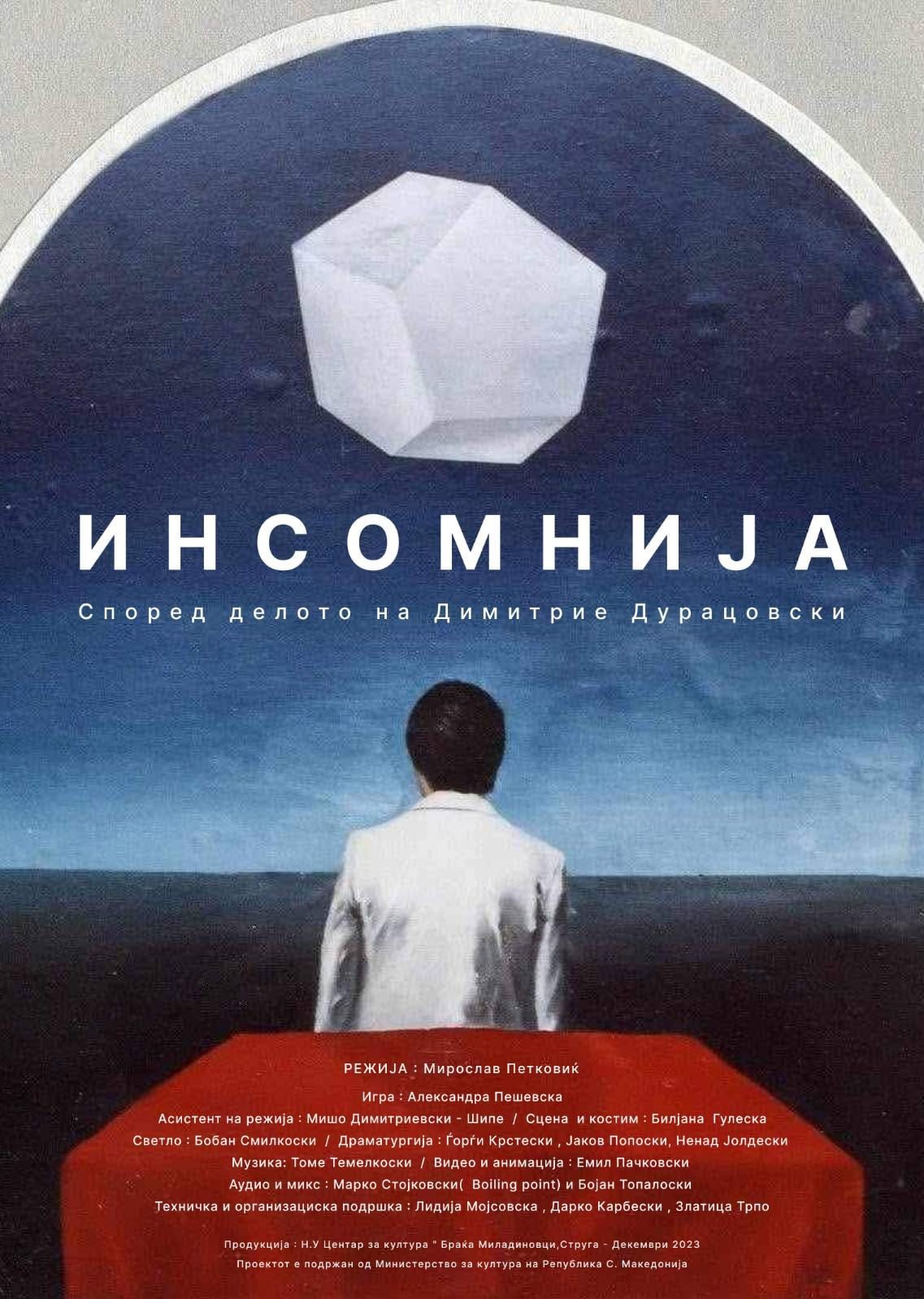 Во Центарот за култура „Браќа Миладиновци“ во Струга денеска и утре, 15 и 16 декември 2023 година, со почеток во 19:00 часот премиерно ќе биде изведена монодрамата „Инсомнија“, по текст на стружанецот Димитрие Дурацовски.