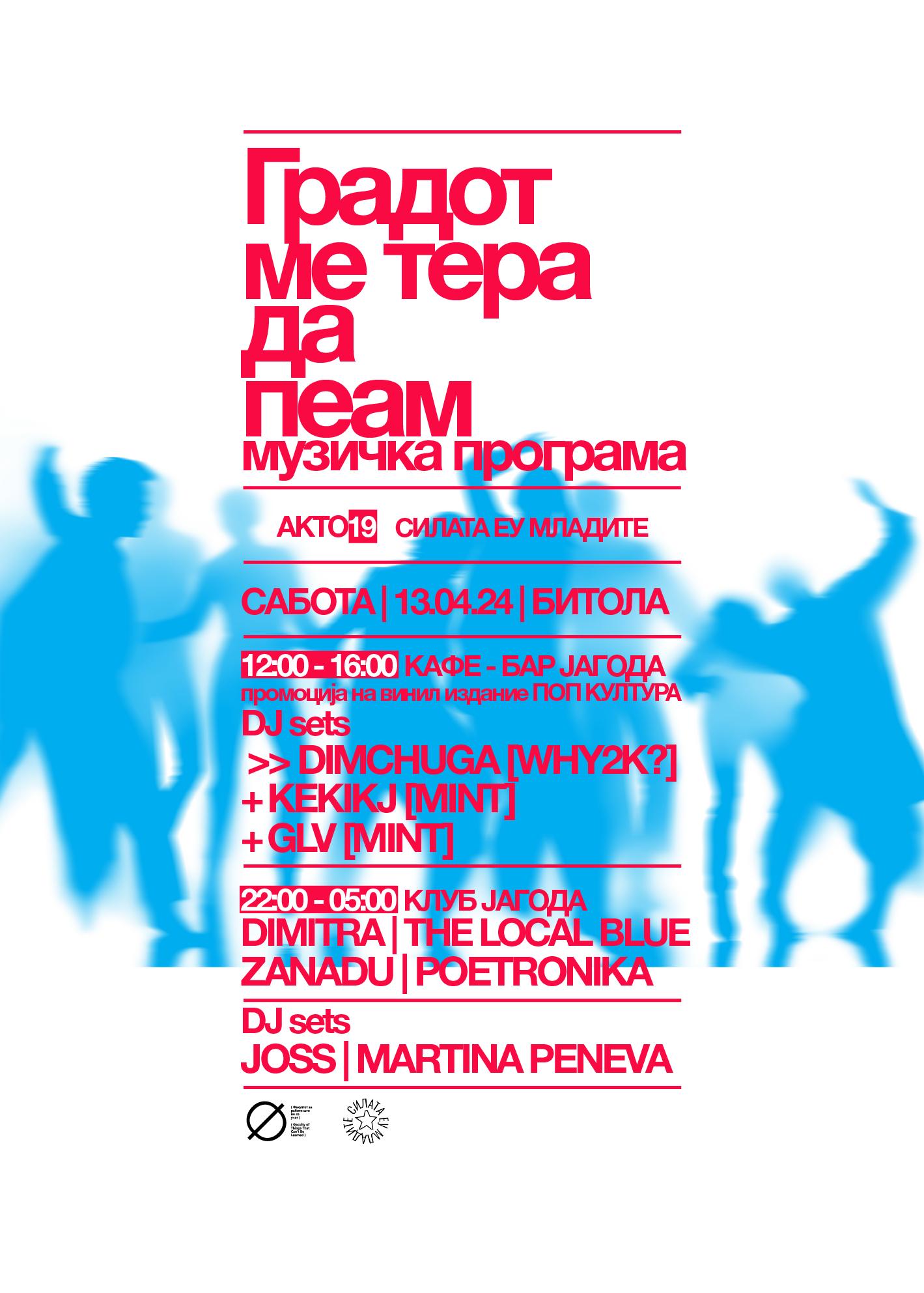 Утревечер (13 април) во Битола ќе се одржи целодневниот музички настан „Градот ме тера да пеам“, во организација на програмата на АКТО 19 „Јавни простори во движење (кон) II“ и платформата „СИЛАТА ЕУ МЛАДИТЕ“.