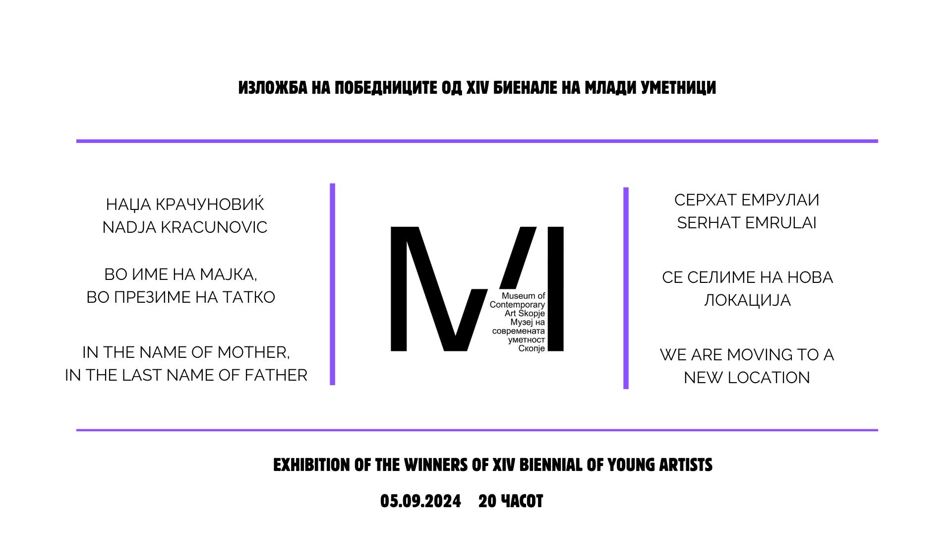 Во Музејот на современата уметност – Скопје на 5 септември, со почеток во 20 часот, ќе бидат отворени самостојни изложби на двајца млади уметници, кои се добитници на наградата „Најуспешен автор и дело“ доделена на 14. Меѓународно биенале на млади уметници „Будења“, 2023.