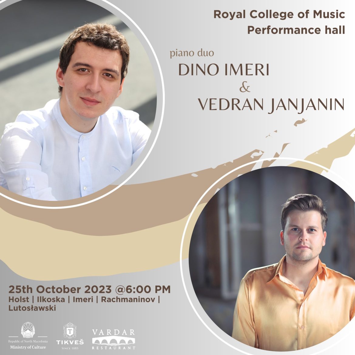 Дино Имери ќе настапи како солист на пијано, но и заедно со хрватскиот пијанист Ведран Јањанин. Ќе бидат изведени дела од: Густав Холст („Јупитер“ од циклусот „Планети“), Сергеј Рахманинов (Суита за две пијана бр. 2), Витолд Лутославски („Варијации на тема од Паганини“ за две пијана), Дамир Имери („Пајдушко“ за пијано за 4 раце и „Сербез Донка“), Дино Имери (обработка на „Јас те пратив на вода, Калино“) и Дијана Имери Илкоска („Корени“).